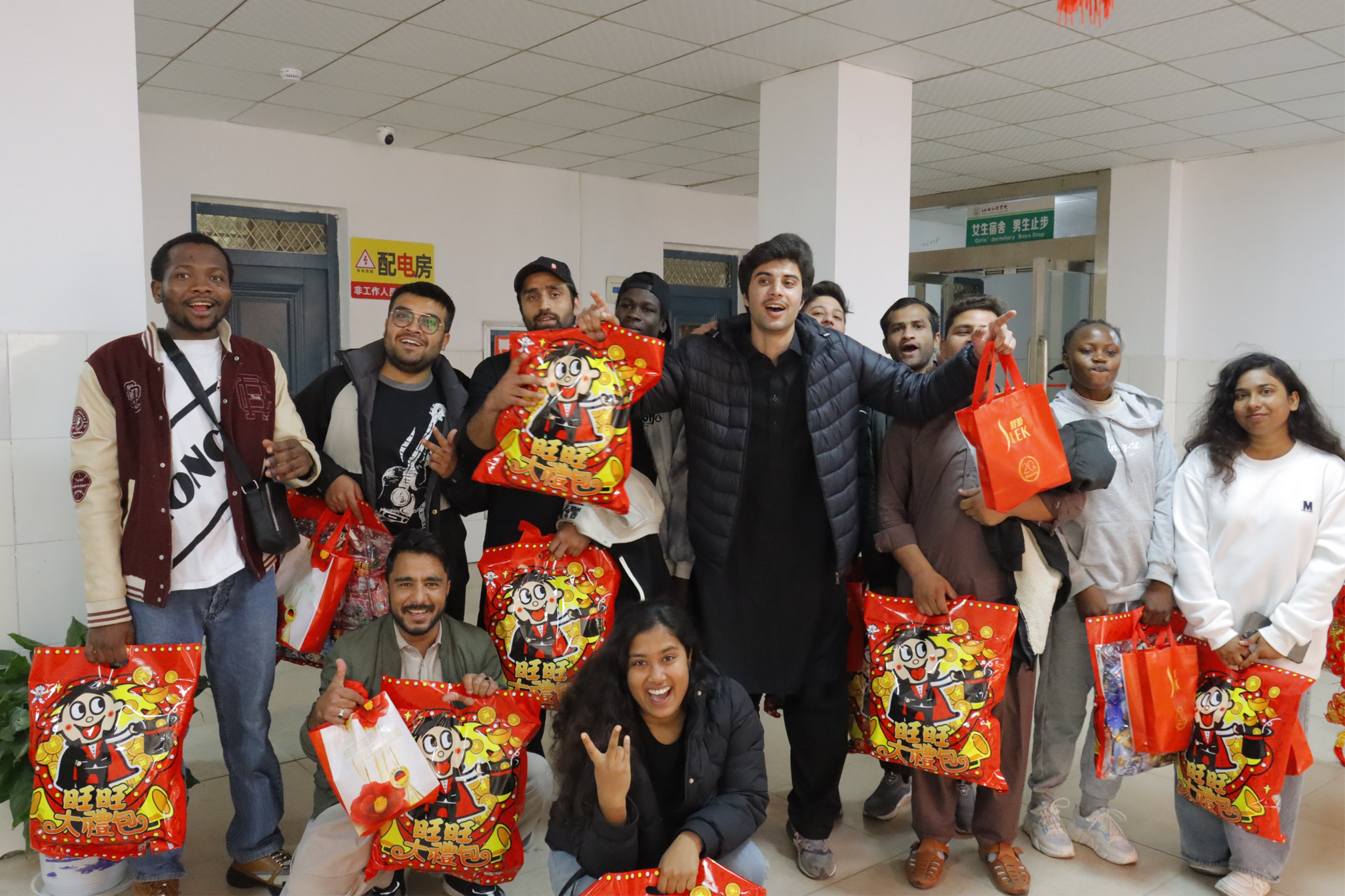 在温馨的发言之后,会议进入了一个特别的环节——过年礼包发放仪式。十位学生代表上台领取了精美的过年礼包,这些礼包包括了寓意吉祥的春节装饰品、中国传统美食以及生活用品等,体现了学校对留学生们的深切关怀。同时,学校还安排了老师将剩余的礼包在留学生宿舍进行发放,确保每位留学生都能感受到节日的喜悦。