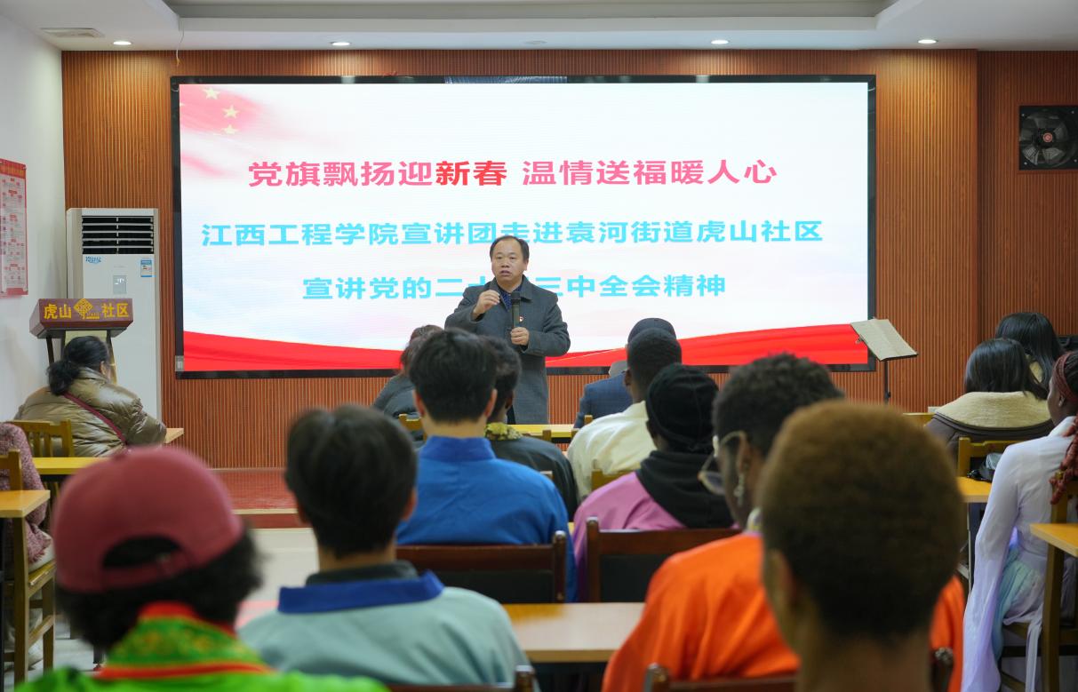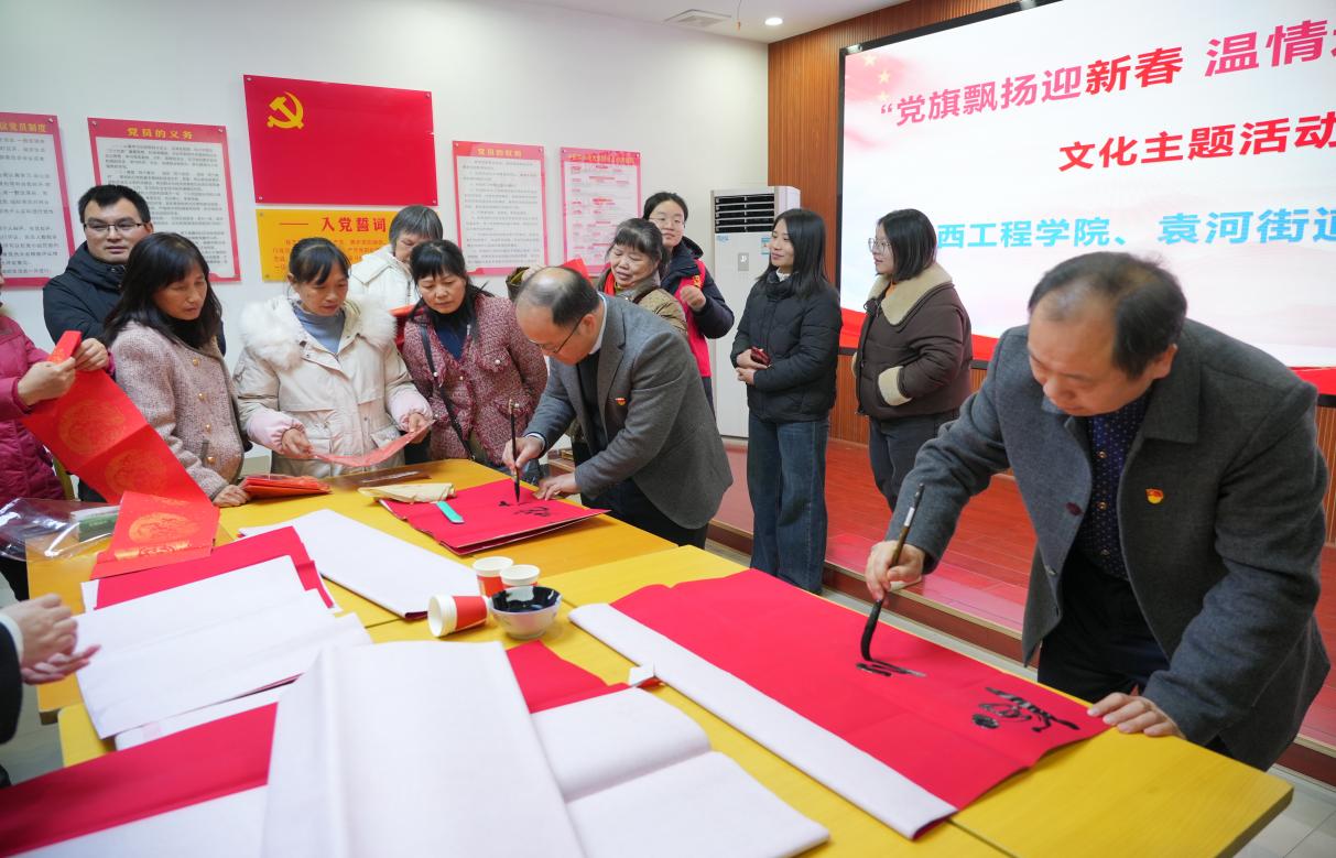 1月13日,学校党委组织部、党委宣传部组织机关党总支和10余名外国留学生走进袁河街道虎山社区,开展宣讲党的二十届三中全会精神、才艺表演、写春联送祝福等活动,旨在传承和弘扬中华优秀传统文化,发挥学校党员先锋模范作用,增强党员责任感与使命感,受到社区居民热烈欢迎和高度赞誉。