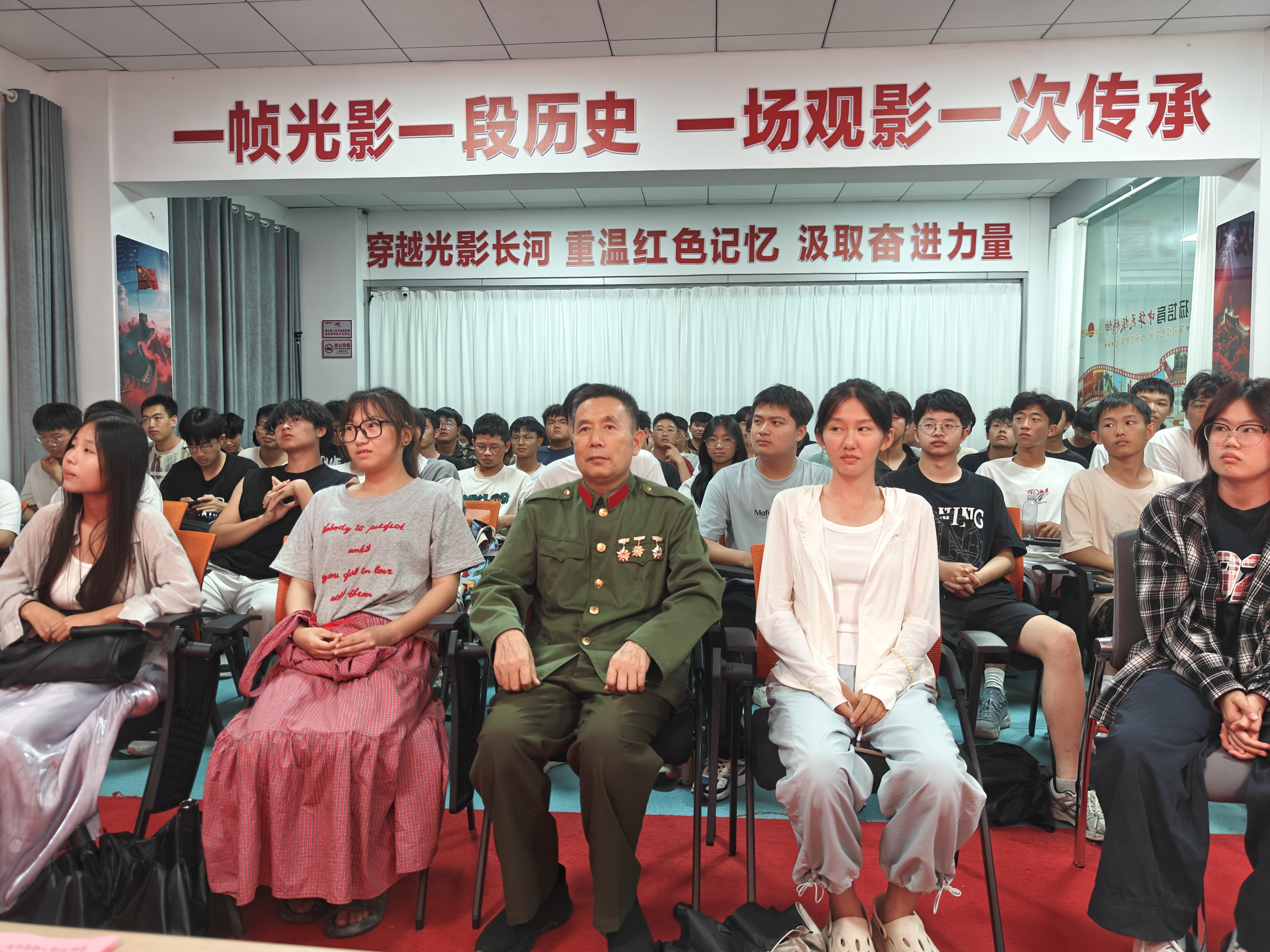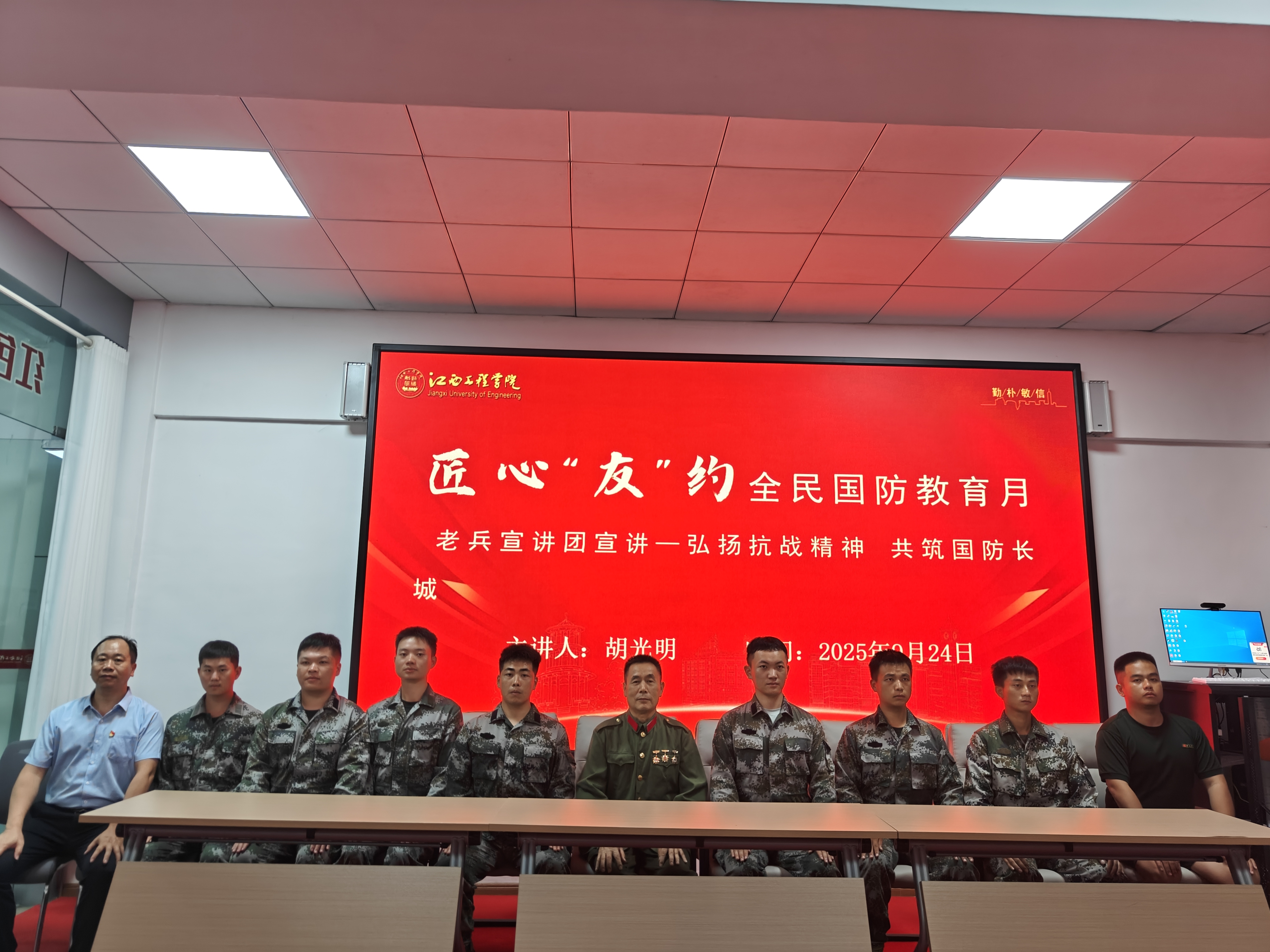 “80年前,中华民族正经历近代以来最沉重的苦难;80年后的今天,我们共同纪念中国人民抗日战争暨世界反法西斯战争胜利80周年……”9月24日,江西工程学院“一站式”学生社区红色影院内,“老兵宣讲团”成员胡光明声情并茂的宣讲,不时引发台下热烈掌声。