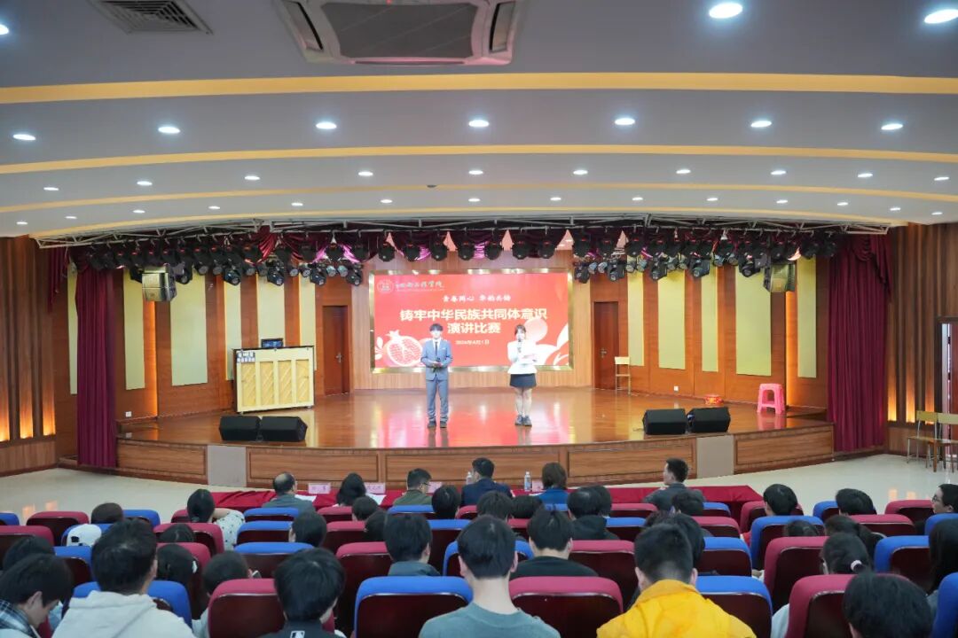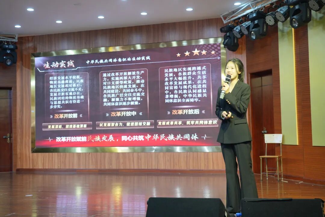 本次比赛以铸牢中华民族共同体意识为主线,经过各二级学院层层选拔、严格筛选,14名优秀学子脱颖而出,站上决赛舞台。演讲现场,选手们精神饱满、意气风发,或引经据典回望历史,或结合实例讲述当下,用多元视角勾勒中华民族共同体的发展脉络——从秦汉“车同轨、书同文、行同伦”奠定大一统根基,到明清改土归流、共守边疆巩固多元一体格局;从抗战时期各族儿女同心御侮、浴血奋战,到新时代各族同胞携手并肩、共建美好家园。真挚的情感、铿锵的话语,生动诠释了中华民族共同体意识的深厚底蕴与时代价值,为现场听众呈现了一堂有温度、有深度的民族团结教育课。